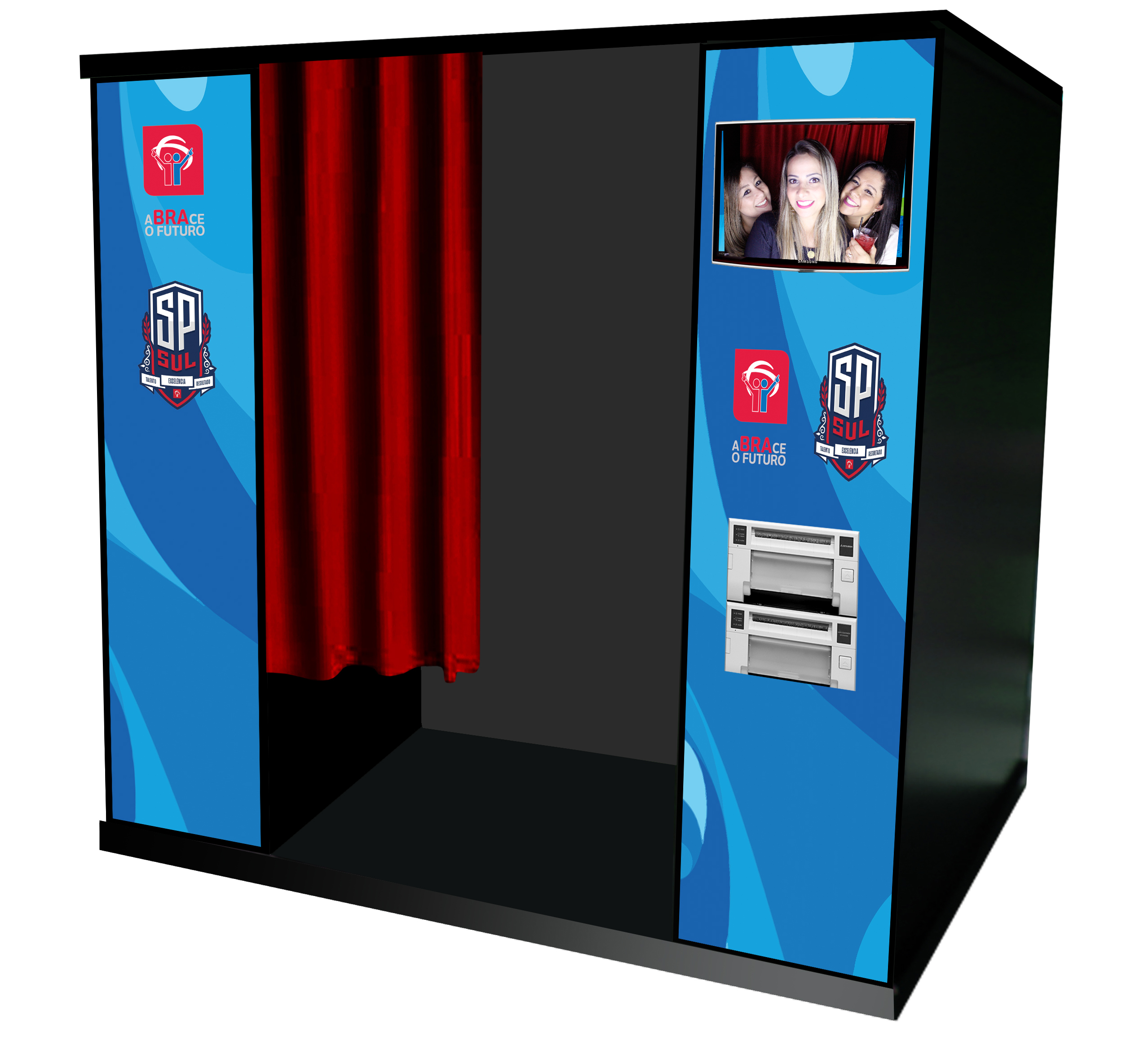 Tem a Cabine Fotográfica com Chroma Key, onde as pessoas são fotografadas, posteriormente escolhem um dos fundos previamente disponibilizados e aplicam na sua foto, que é impressa rapidamente e pode ser retirada após a saída da cabine.